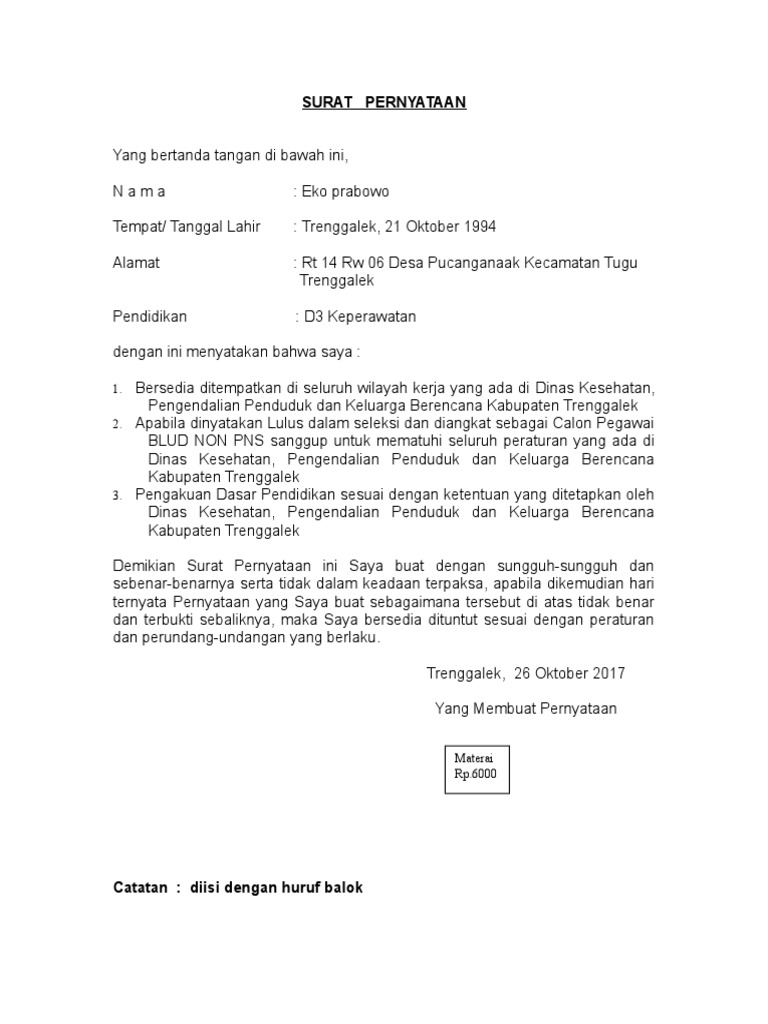 Contoh Surat Pernyataan Penempatan Kerja