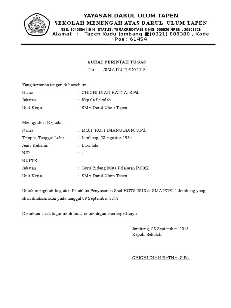 Contoh Surat Tugas Perjalanan Dinas Guru Nusagates